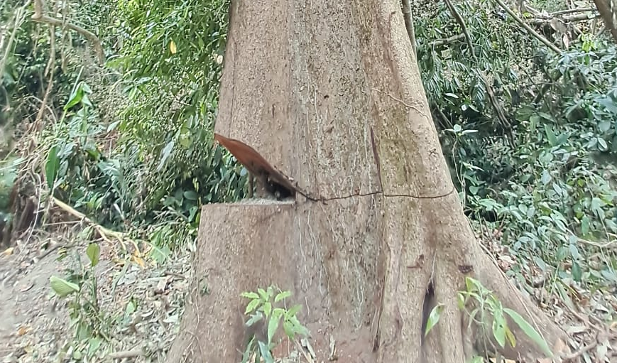সোমবার (২০ এপ্রিল) দুপুরে সরেজমিনে গিয়ে দেখা যায়, পোলা ব্যাঙ ঝিরির স্বাভাবিক পানি প্রবাহ বন্ধ করে পাহাড় কেটে ট্রাক চলাচলের উপযোগী রাস্তা তৈরি করা হয়েছে। দূর থেকে দেখে মনে হচ্ছিল উন্নয়নের কাজ চলছে। কিন্তু কাছে গেলে বোঝা যায়, শত বছরের পুরোনো মাতৃগাছ প্রায় বিলীন হয়ে গেছে। যন্ত্রচালিত করাত দিয়ে গত দুই বছর ধরে গাছ কাটা হচ্ছে।