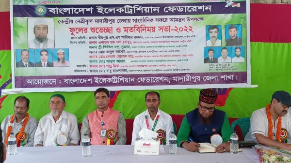 মাদারীপুর প্রতিনিধি| মাদারীপুরে বাংলাদেশ ইলেকট্রিশিয়ান ফেডারেশন (বি.ই.ইফ) এর কেন্দ্রীয় নেত্রীবৃন্দের মাদারীপুর জেলায় সফর আমন্ত্রণ উপলক্ষে জেলা শাখার ফুলেল শুভেচ্ছা ও মতবিনিময় সভা অনুষ্ঠিত হয়েছে। রবিবার (২৭ মার্চ) দুপুরে সাড়ে ১২